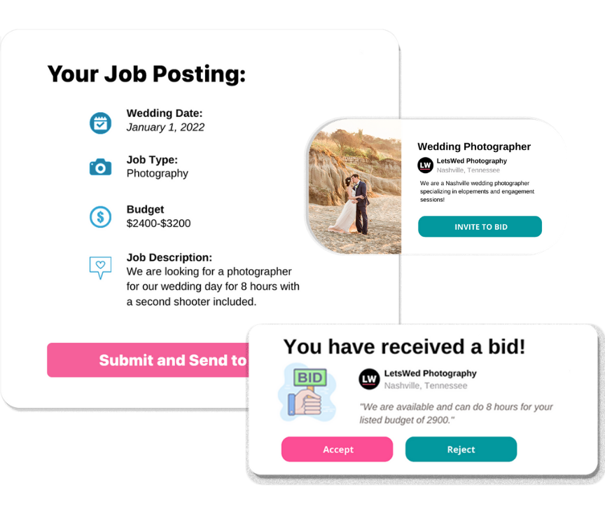 Stop chasing vendors and let them come to you! Simply post your wedding details, and our top vetted vendors send bids for you to accept or deny.